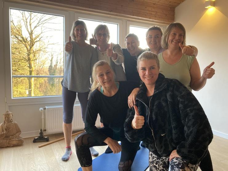 Auch der Buddha ganz links ist Zeuge: Die Teilnehmer von Pilates & Deep Stretch bei Alex (vorne links) sind immer motiviert und haben ganz viel Spaß.